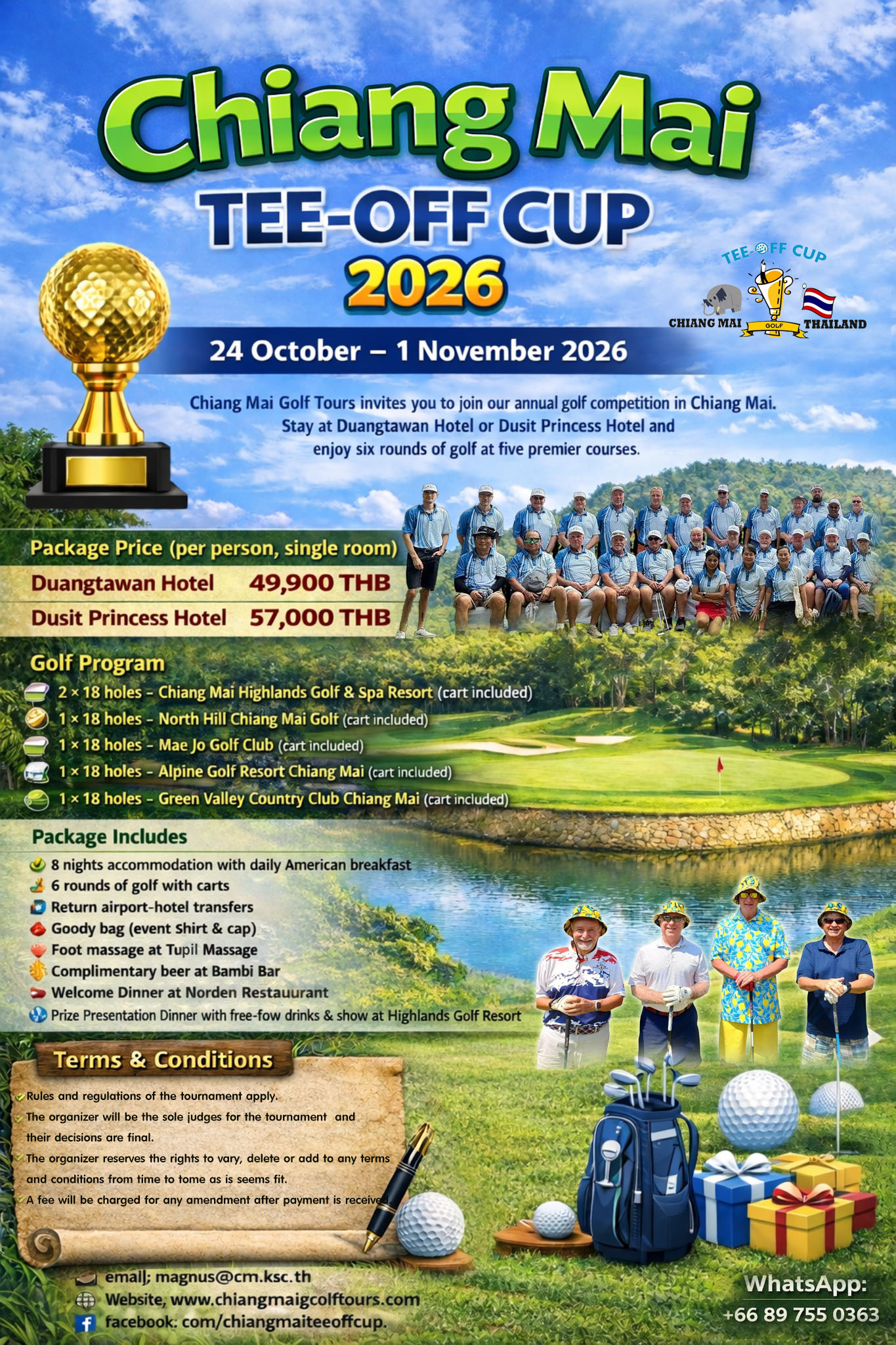 CHIANG MAI TEE-OFF CUP 24 October-1 November 2026CHIANG MAI TEE-OFF CUP 2026 4 October-1 November 2026 Chiang Mai Golf Tours with Friends invites you to join our annual golf competition in Chiang Mai. Stay at Duangtawan Hotel or Dusit Princess Hotel and enjoy six rounds of golf at five premier courses. ![]() |